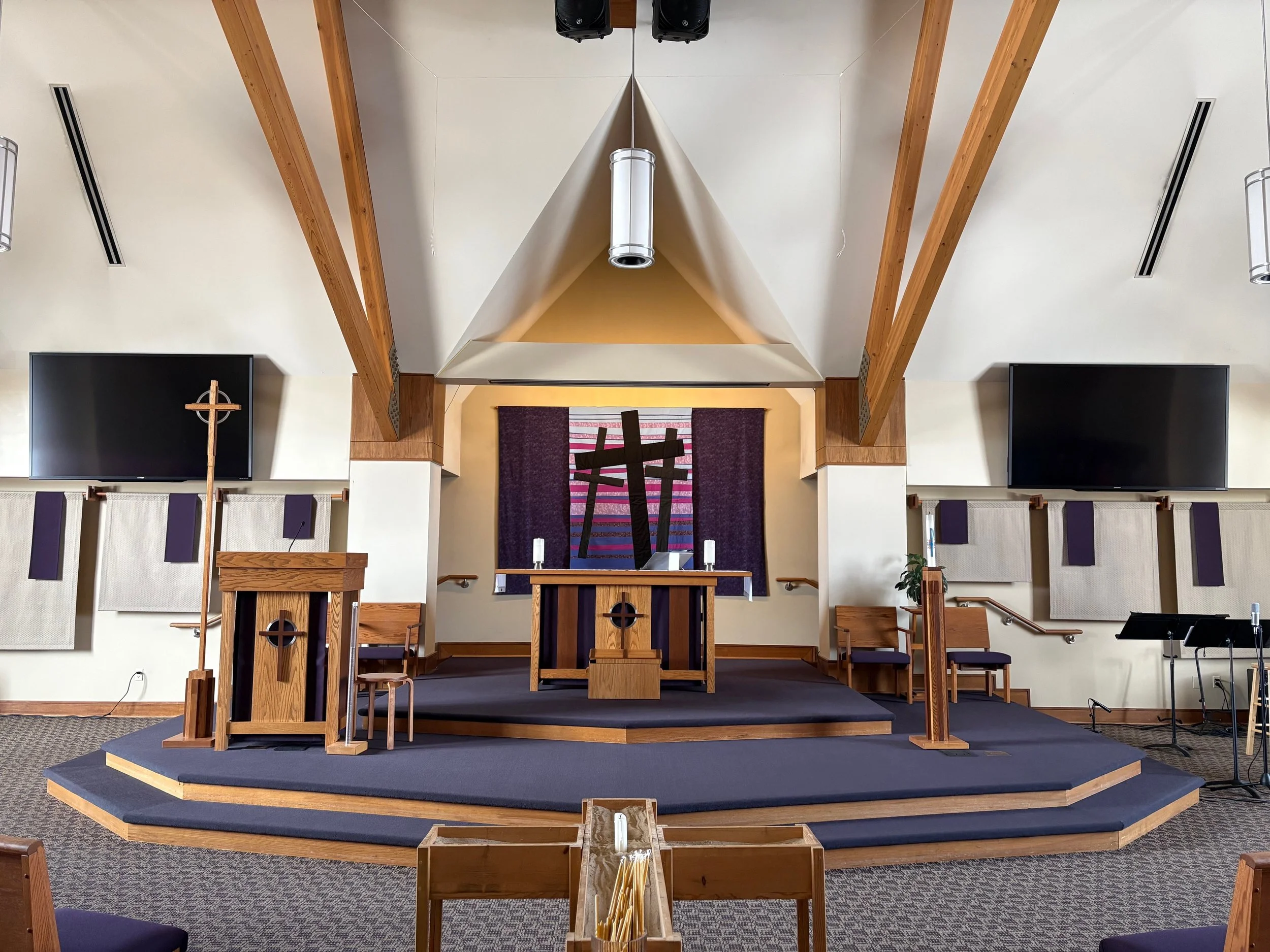 You will be greeted when you arrive and given a bulletin with the order of service. Our service is also projected on the screens in front of the church.